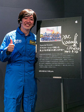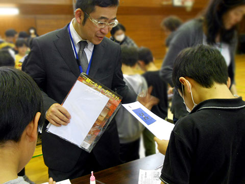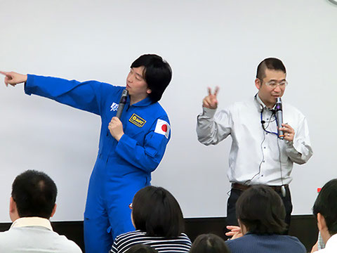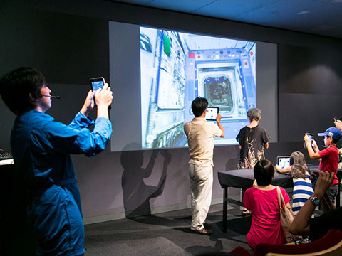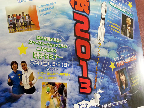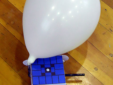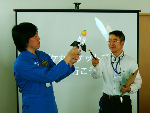 手作り望遠鏡の使い方を模型の月をねらって練習。