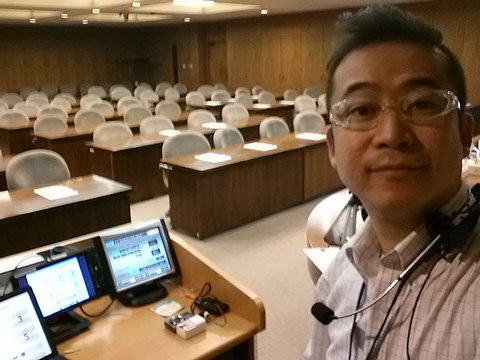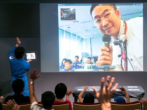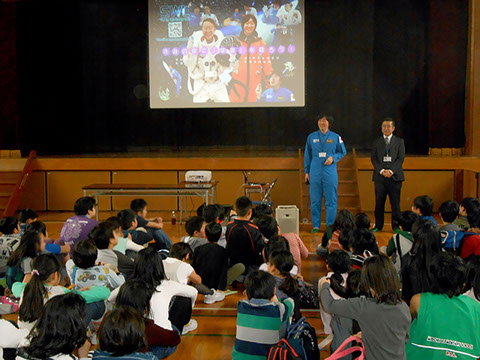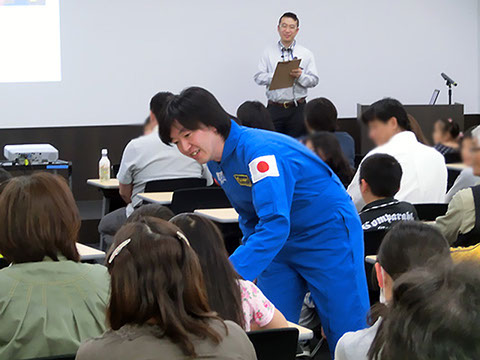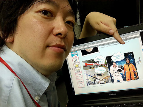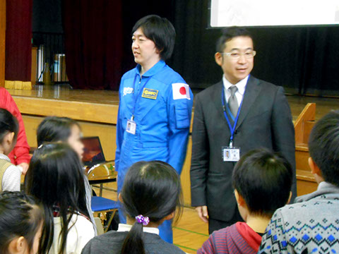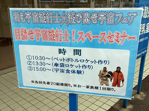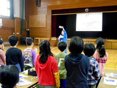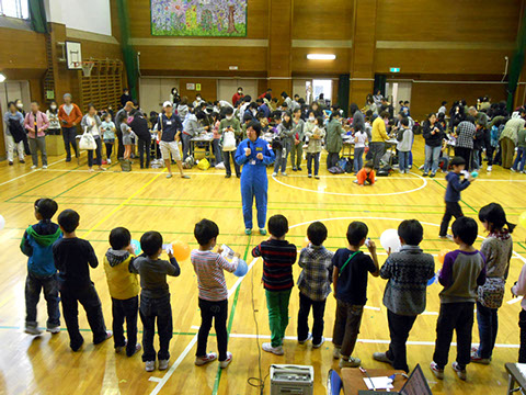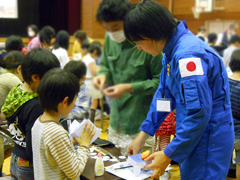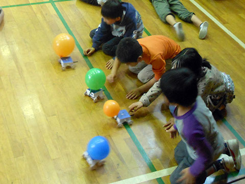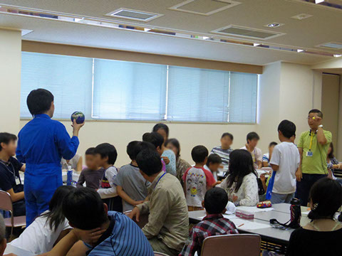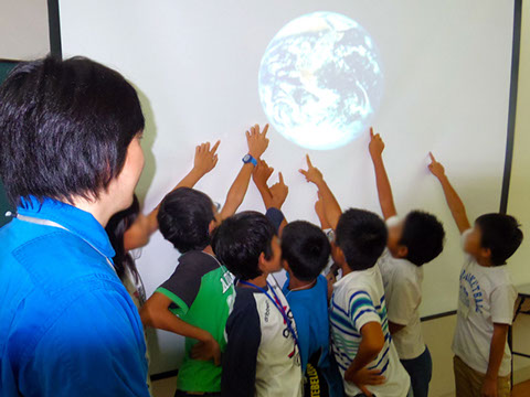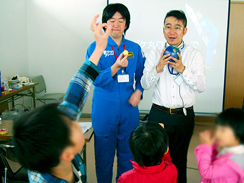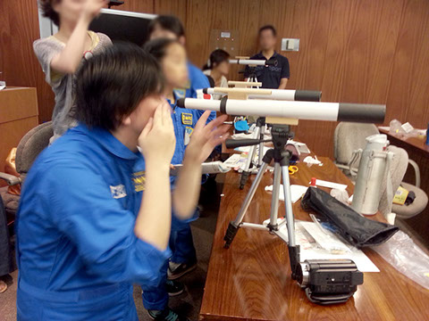 手作り望遠鏡の使い方を模型の月をねらって練習。